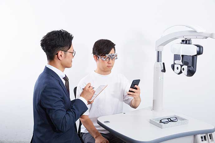 まずは眼の健康診断「測定」から!「視力」をはじめピント合わせの力「調節力」など、あなたの眼を正しく測定し、見え方はもちろん、今の生活に適した“自分専用の最高のメガネ”を作るお手伝いをいたします。